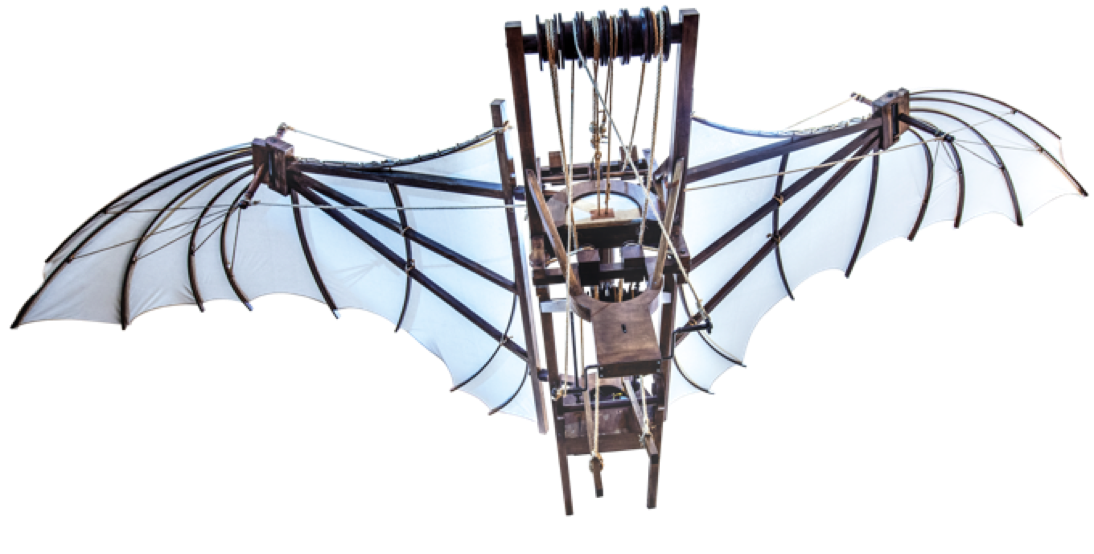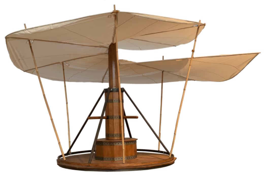 2019 a vu célébrer partout en Europe le 500ème anniversaire de la mort de Léonard de Vinci. Ce génie universel a très tôt été attiré par les oiseaux, surtout leur vol. Il écrit autour de l’année 1505 le Codex sur le “Vol des oiseaux“, document rédigé en italien, mêlé de langue lombarde et en écriture spéculaire, dans lequel il dessine des principes de machines volantes… qu’il n’a jamais construites. A partir de ces écrits, après “L’Ornitottero“, a été réalisée “La Vis“ !